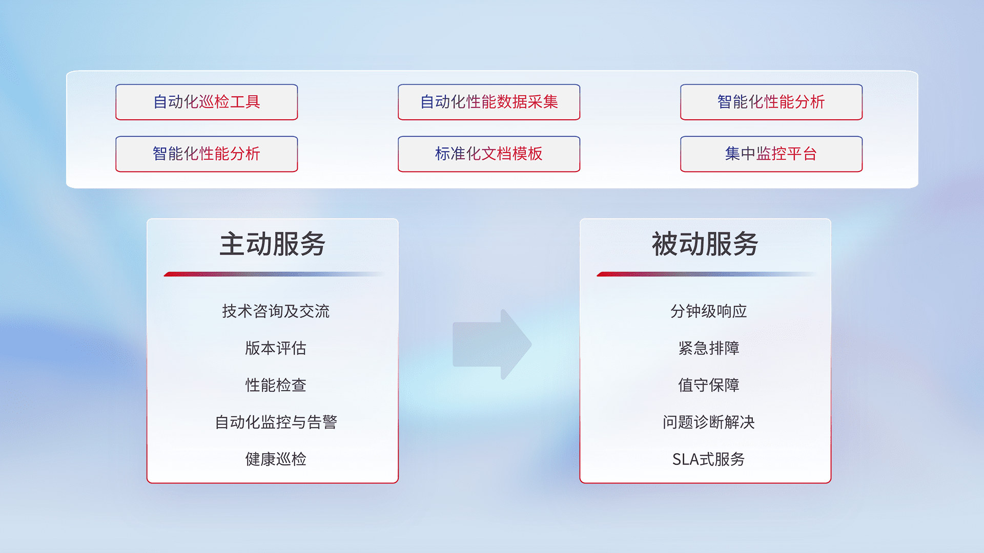 智能化工具和标准化文档,,,,保障服务质量,,提供主动服务(包含技术咨询、、、、版本评估、、、性能检查、、自动化监控与告警、、健康巡检)和被动服务包含(分钟级响应、、、紧急排障、、、、值守保障、、、问题诊断解决、、SLA服务)。。。